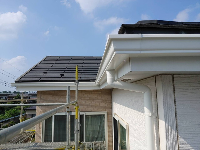 群馬県高崎市 K様邸 既存の雨どいに穴が開いてしまっていて雨垂れしてしまっていました PC-50には芯にアイアンが入っているので劣化や飛来物による穴あきが防げます 使用材料 パナソニック PC-50 工事内容 雨樋交換工事 軒樋35.84m 竪樋31.38m 工事費用 ¥530000円(税込み) 工事日数 2日