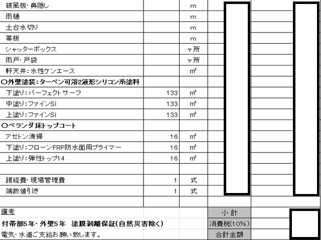 正直申し上げますと、建物の状態によって⾦額は変わります。また、どこまでやるのかによっても、⾦額は変わります。塗るだけなら仕事は簡単ですが、傷んでいたら、 下地に随分手間がかかります。 | |