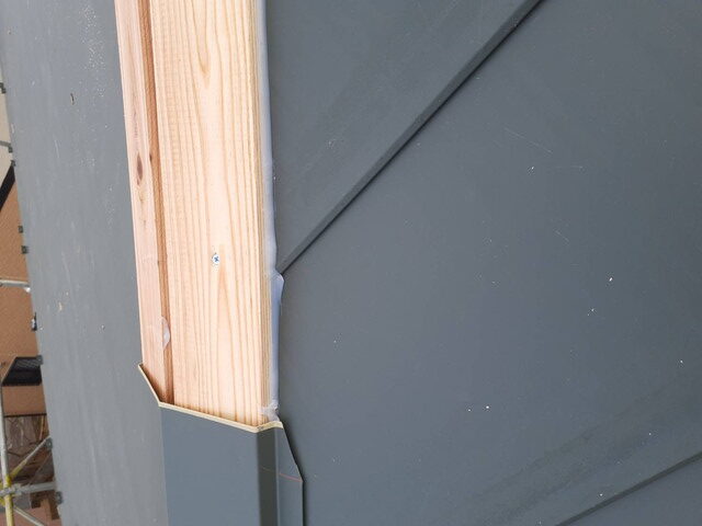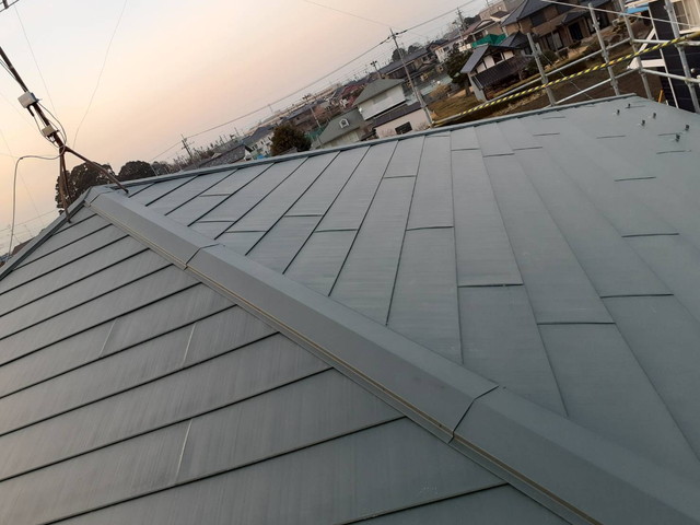実際の施工では、埼玉県本庄市「横暖ルーフS」を用いたカバー工法によるリフォーム工事が行われました。まず、現地調査と採寸を経て、既存屋根上改質アスファルトルーフィングを敷設。その上に「横暖ルーフS」を軒先から棟までビスで固定する本葺き作業を実施し防水性耐久性強化。さらに、棟板金仕上げには、防腐剤が塗布された貫板を新設