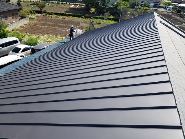 まず、既存屋根の撤去後、下地の野地板の状態を確認し、不陸調整や必要な補修を施した上で、ルーフィング(防水シート)の施工を行いました。今回は高性能な改質アスファルトルーフィングを使用し、屋根全体に丁寧に張り込みました。この工程は雨水から建物を守るために非常に重要な作業です。