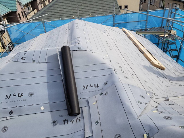 ・軒先から棟方向に向かってルーフィングを張っていきます。