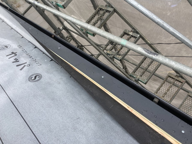 屋根の傾斜と寸法に合わせてケラバ用の水切り板金を設置。風の吹き込みを防ぐよう、屋根材との隙間を最小限に仕上げました。