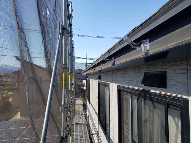 パナソニック製NF-1型雨どいは、耐久性排水性能優れた製品で、多くの住宅に採用されています。今回はこのNF-1型に対応する「専用の受け金具」を均等なピッチで設置し、しっかりと勾配を確保して取り付けを行いました。