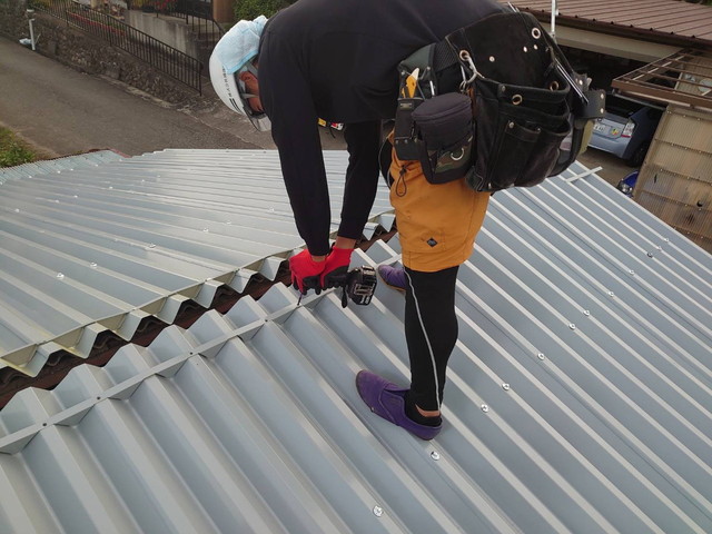 現場では、屋根の形状や勾配、軒先・ケラバの寸法に合わせて板金をカットし、一枚一枚丁寧に取り付けていきました。固定にはステンレスビスを使用し、風による浮き上がりやズレを防止。雨仕舞を意識して、必要に応じてシーリング処理も併用しています。