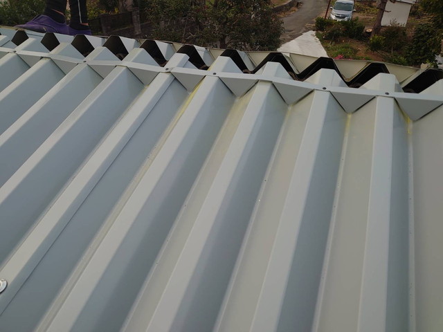 今回は、既存の波板スレート屋根にタフレッシュを使ってカバー工法を行った現場で、仕上げとして面戸板金を取り付けました。