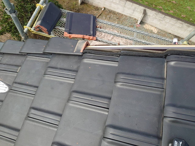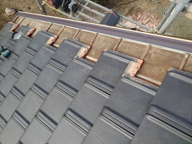 瓦は既存のものを再利用しつつ、破損していたものについては同等品を用いて交換。固定にはステンレス製のパッキン付きビスを使用し、風による再脱落を防ぐための施工を徹底しています。また、ケラバ瓦の下にはケラバ水切り板金を設置しました。