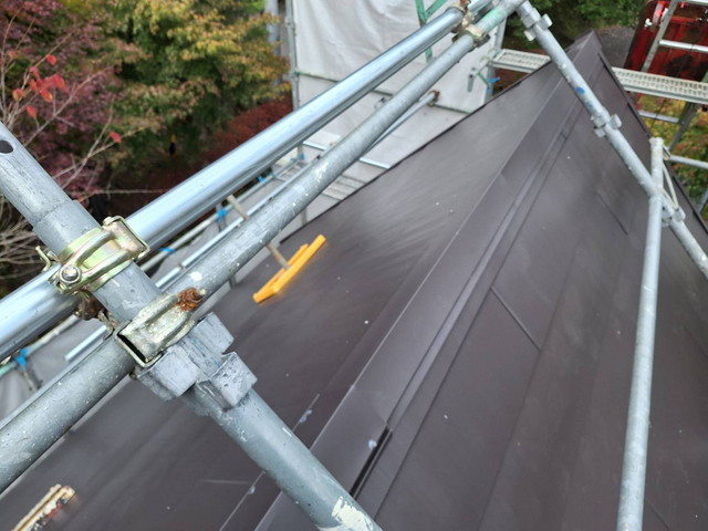 10寸勾配ともなると、雨や雪の流れは非常にスムーズですが、その分作業中の安全確保が最重要となります。今回の施工では、屋根足場(屋根上の仮設足場)をしっかりと設け安全を徹底しました。