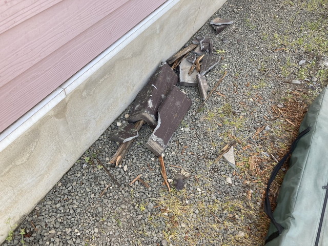 写真をご覧いただくと、屋根の袖部分の瓦が強風によって外れ、地面に落下しているのが分かります。