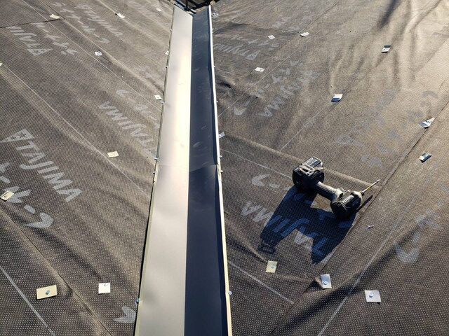谷部分がある場合は、防水性能を高めるための谷板金を先行して取り付けます。重ね代や勾配、水の流れを意識しながら施工することで、雨漏りを防ぎます。