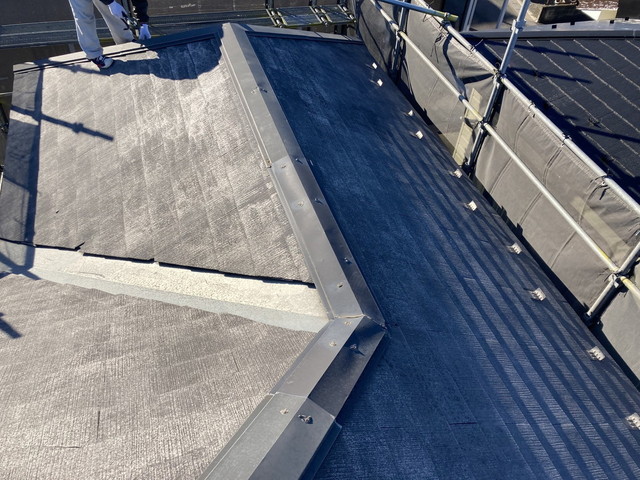 まず既存屋根の状態を確認し、劣化が進んでいた棟板金を丁寧に撤去しました。