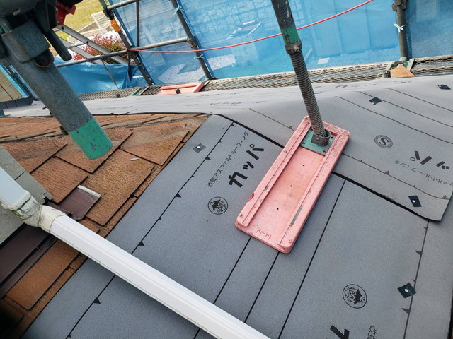 写真にあるように、既存のコロニアル屋根の上に防水シートを丁寧に敷き込んでいきます。