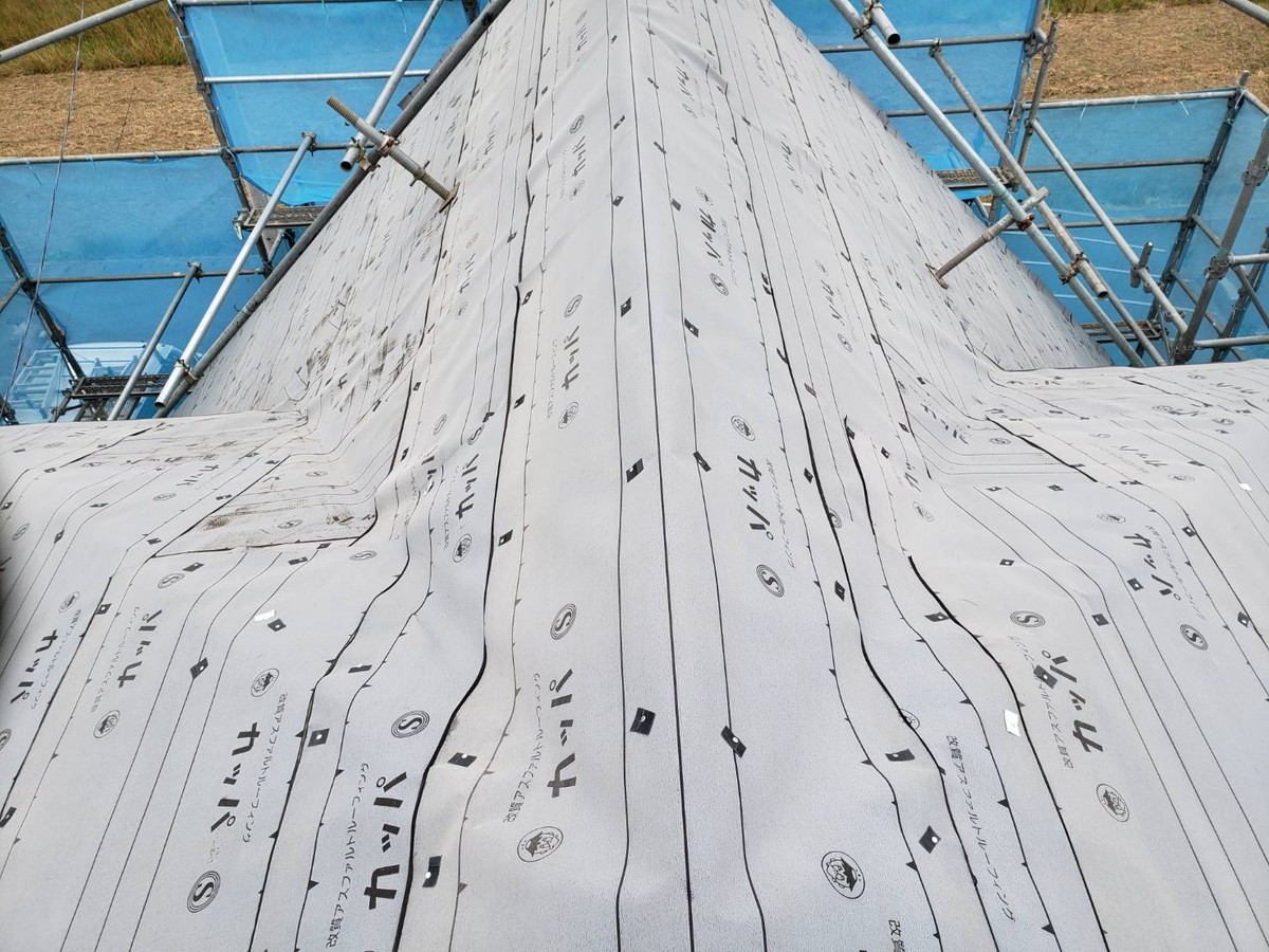 防水シートは屋根の寿命を左右する重要な工程で、写真にもある通り、重ね幅や固定位置を正確に守りながら施工しています。