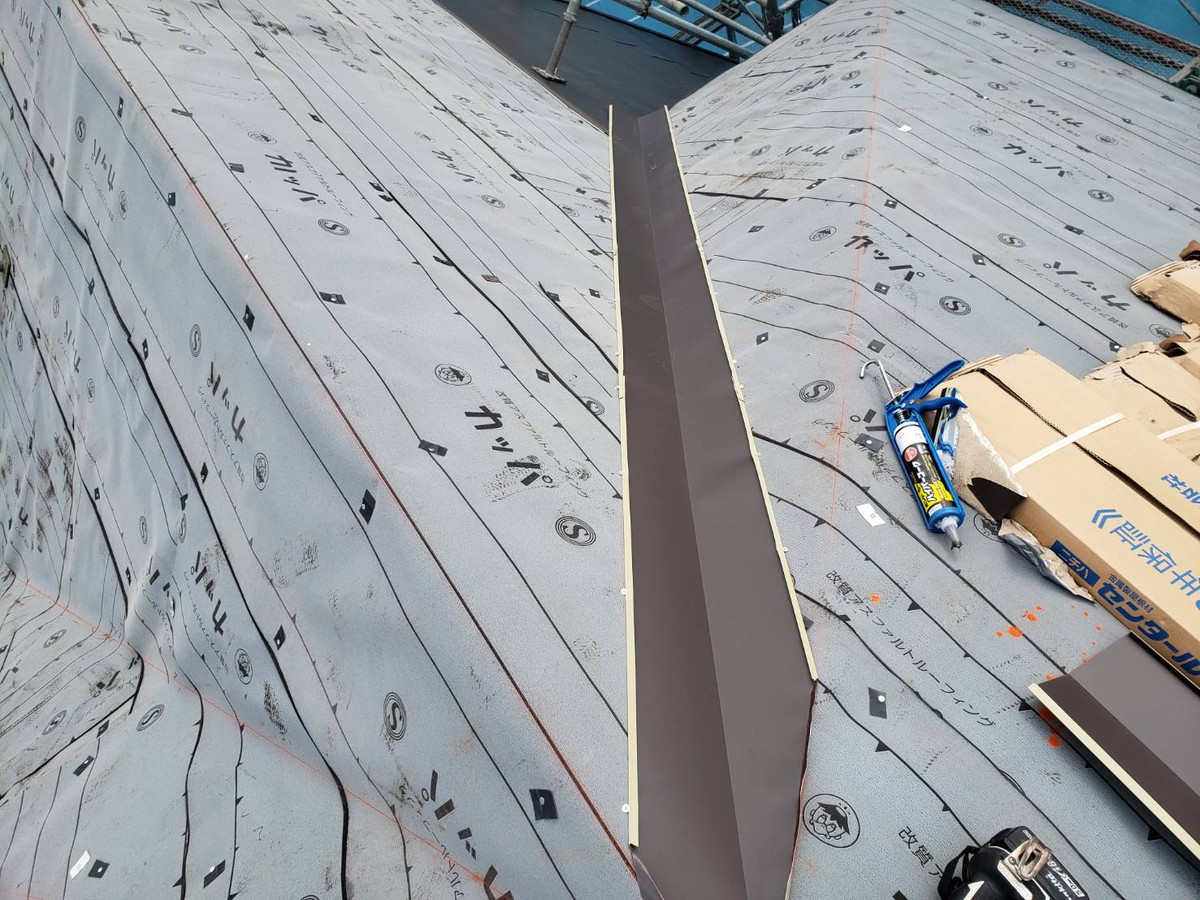 その後、屋根の要となる谷部分の板金施工を行いました。
