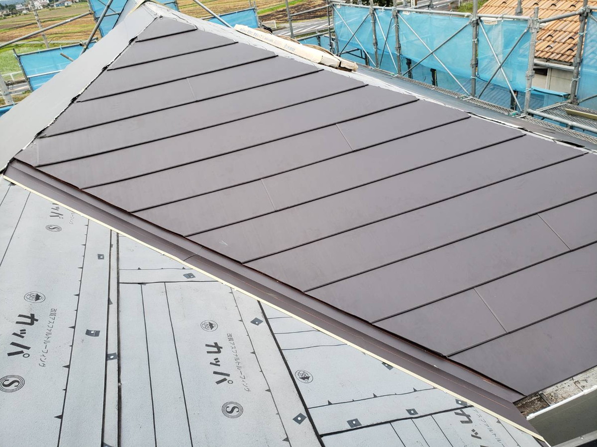 施工はまず、既存屋根の状態を丁寧に確認し、防水シート(ルーフィング)を全面に施工しました。