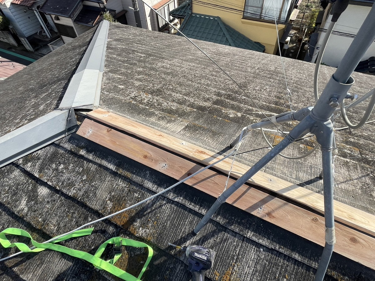 まず、強風で飛んだ棟板金の状態を確認。板金の変形や外れた部分、釘の抜け・緩み、下地の貫板の腐食の有無を細かく点検します。