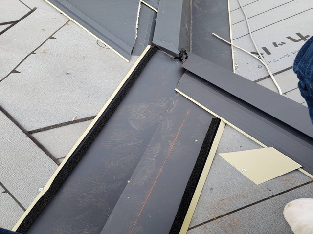 谷板金はルーフィングの上から適切な位置に設置し、立ち上がりや重ね代を確保することで、雨水がスムーズに流れるよう調整しています。また、屋根材との取り合い部分には隙間ができないよう、細部まで確認しながら施工を進めました。
