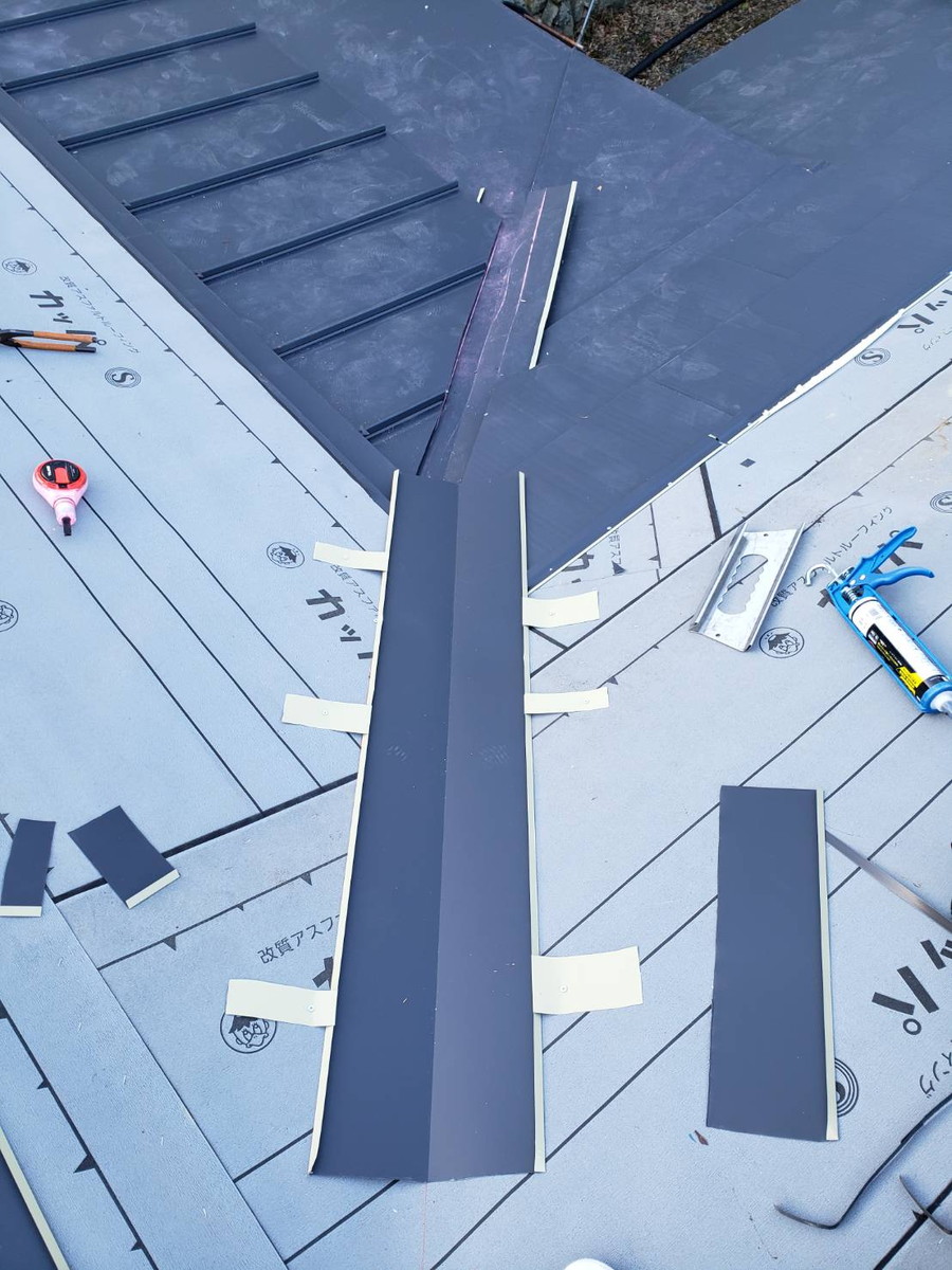 写真からも分かるように、仮合わせ・微調整を繰り返しながら仕上げることで、複雑な屋根形状でも安心できる防水性能を確保しています。