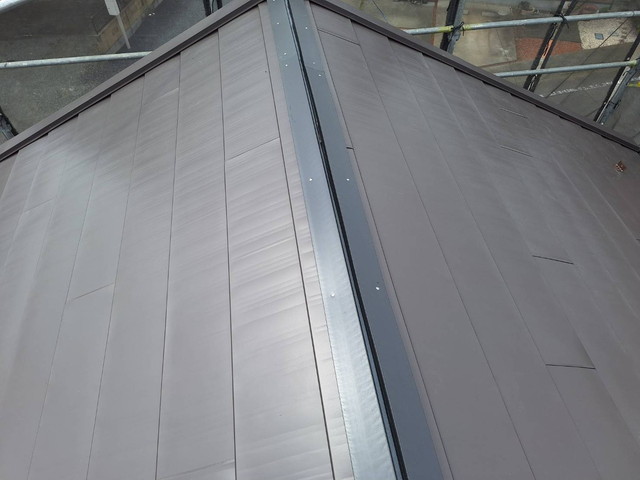 3 棟板金と雨仕舞い処理 屋根の頂上部分(棟)には、しっかりと棟板金を取り付けて雨水の侵入を防ぎました。貫板には木製ではなく樹脂製の物を使用したので腐りにくい素材となっております。また、屋根の端部分も雨仕舞い処理を施し、長期間安心して使用できるように仕上げました。