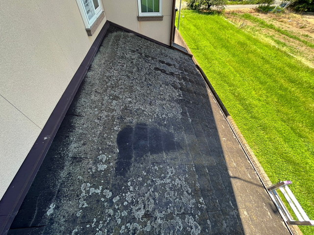 特に下屋根部分は苔の付着が多く、防水機能の低下が見られました。