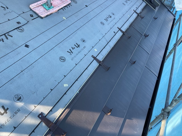 今回の群馬県伊勢崎市T様邸では、まず既存屋根の状態を確認し、防水性能を高めるためにルーフィング(防水シート)を丁寧に施工しました。群馬県伊勢崎市T様邸 スレート屋根 横暖ルーフ 写真にもある通り、下地処理をしっかり行うことで、屋根全体の耐久性が大きく向上します。