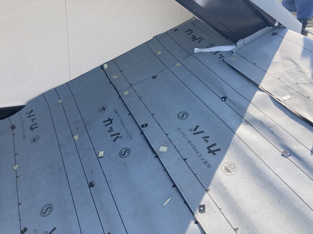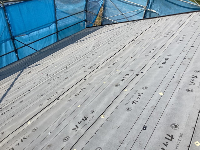 写真にあるように、屋根全体に防水シートを隙間なく敷き込み、重ね幅や固定位置も規定通りに施工しています。