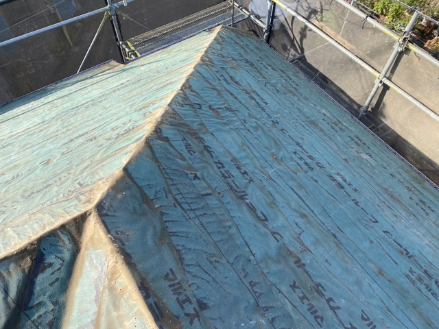 スレートを剥がすと見えてくるのが、下葺き材や屋根の構造材である「野地板(のじいた)」です。傷んでいる部分は張り替え、しっかりとした土台にします。群馬県前橋市 スレート屋根の葺き替え工事 既存スレート材の撤去