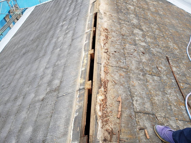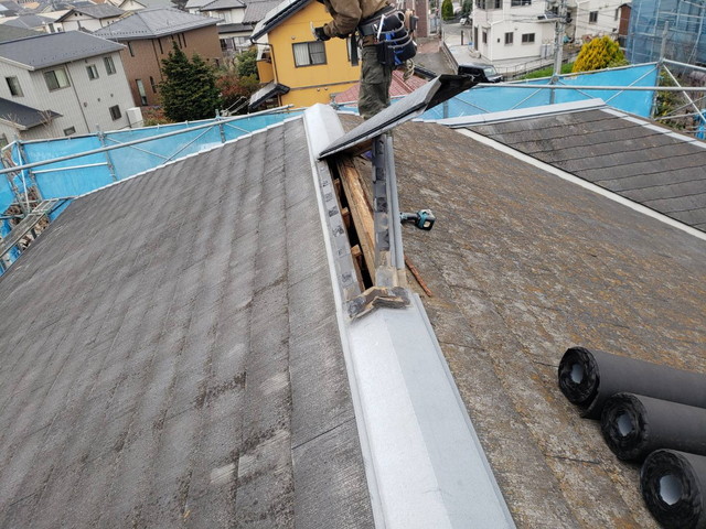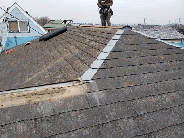 まずは既存の棟板金を撤去します。特殊な換気棟が設置されていたので換気棟も撤去します。スレート材の表面にはコケが生えてしまっているので滑らないように足元に注意しながら撤去作業を行います。