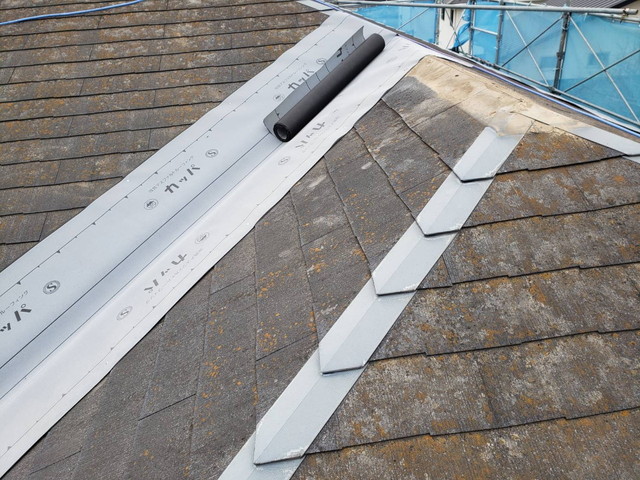 左右の面からルーフィング材を織り込むように施工し谷部のルーフィング材が3重になるように施工します。