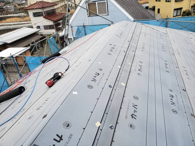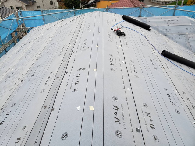 ルーフィング材による下葺き施工です。ルーフィング材とは屋根の一次防水に使用する防水シートです。