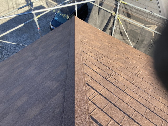 群馬県前橋市H様邸 葺き替え工事 コロニアル ディプロマットスター最後にディプロマットスター専用の同質棟を取り付け、屋根全体と統一感のある仕上がりとなっています。