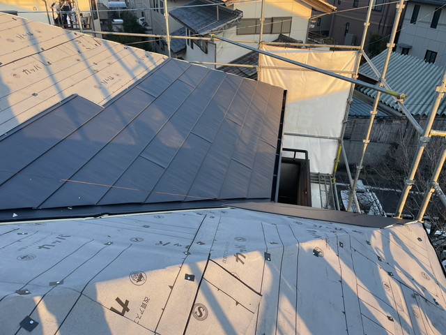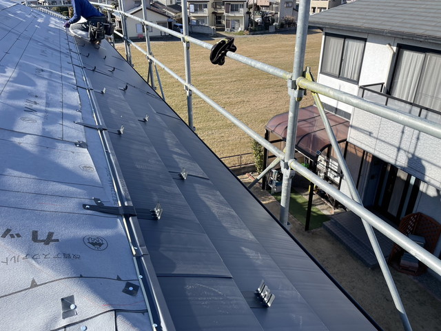 今回はガルバリウム鋼板材ニチハ製横暖ルーフsの本体葺きです。