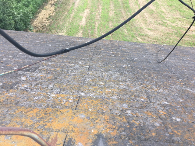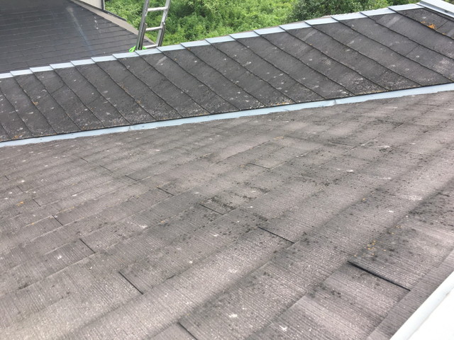既存の屋根材はスレート材ですね。スレート材の表面は経年劣化により塗膜が剥がれてしまっていてスレート材の色落ちやスレート材表面にコケの発生があります。