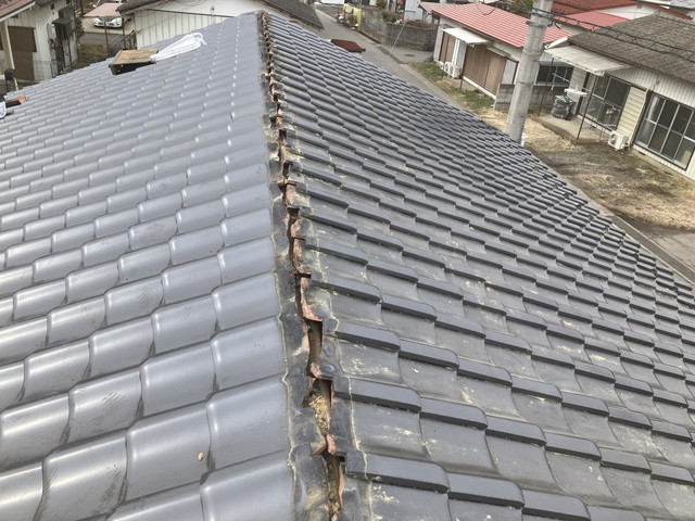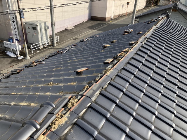 今回はまさに棟瓦が崩れ、落下した瓦が道路にまで飛んでいたそうです。