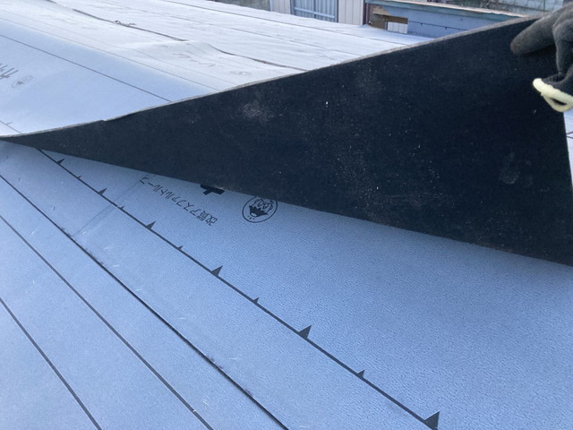 その後、防水の要となるルーフィング(防水シート)を施工しました。