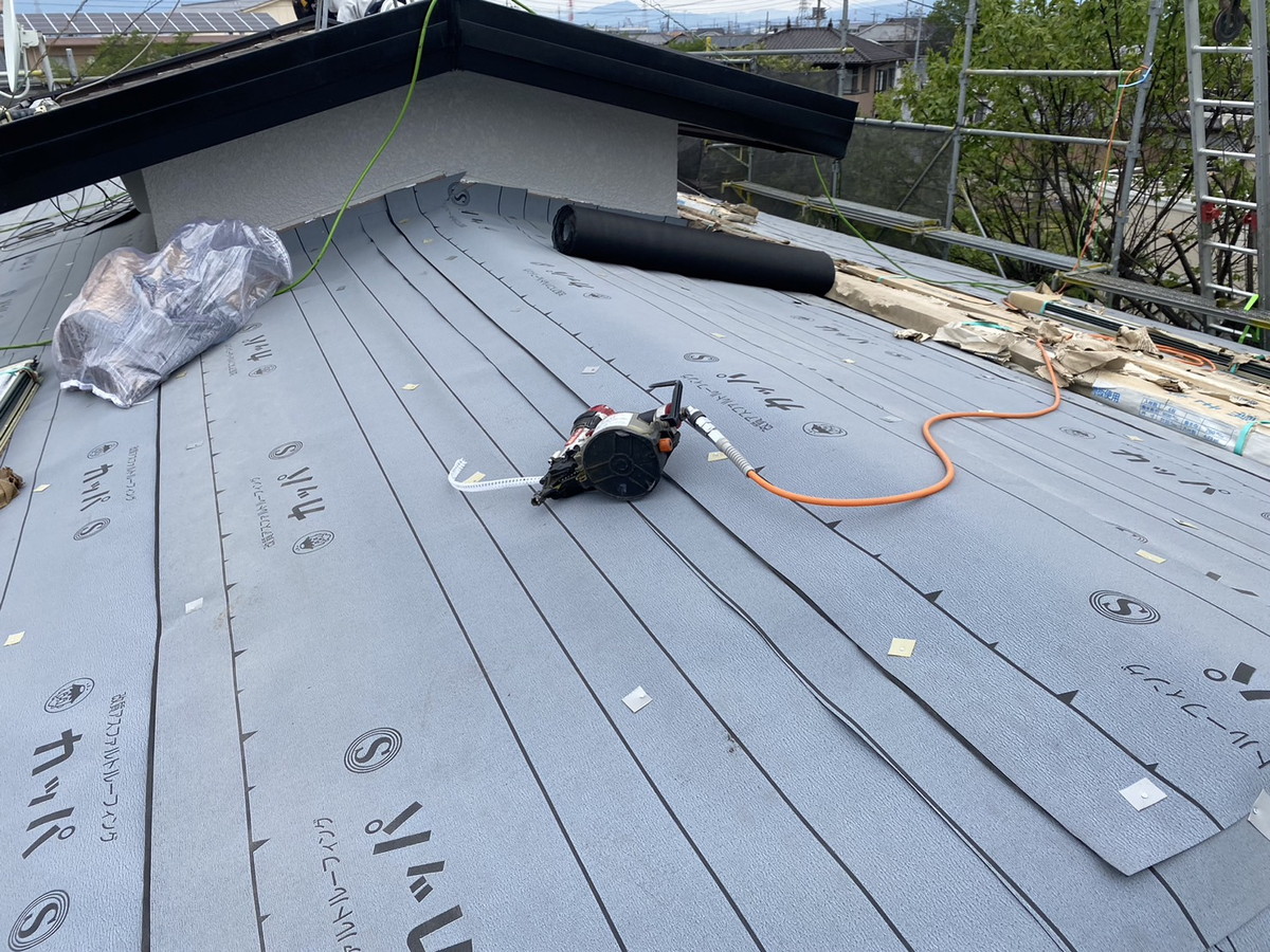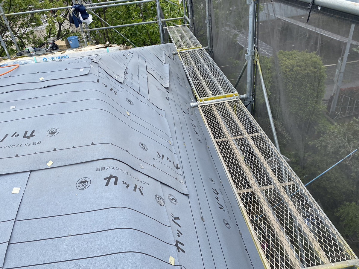 次に高品質な改質アスファルトルーフィングを全面に敷設します。ルーフィングは「屋根の防水の要」とも言われ、仕上げ材以上に重要な工程です。重ね幅や固定方法を守ることで、長期的な雨漏りリスクを大きく低減します。