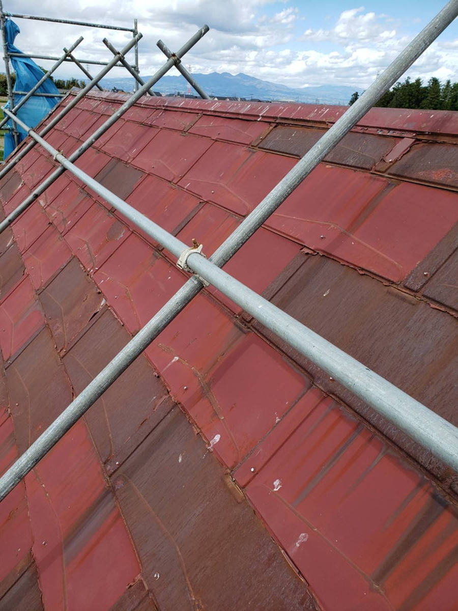 今回の群馬県藤岡市F様邸では、既存の金属屋根の上からカバー工法を採用しました。写真にあるように、まずは足場を設置し、安全を確保した上で既存屋根の状態を丁寧に確認します。