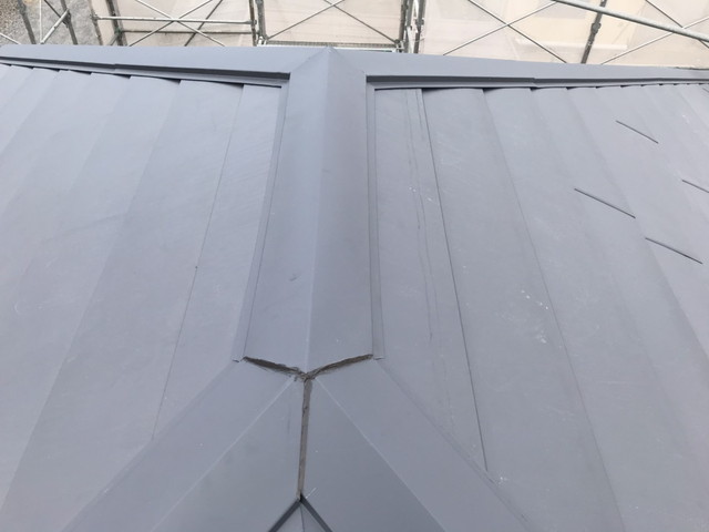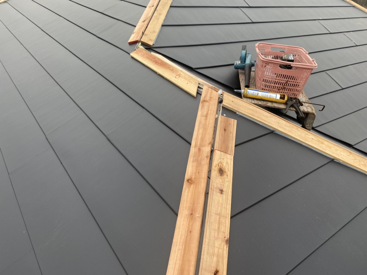 写真のように、屋根面のラインを揃えながら固定し、寄棟特有の複雑な形状でも美しく仕上げていきます。