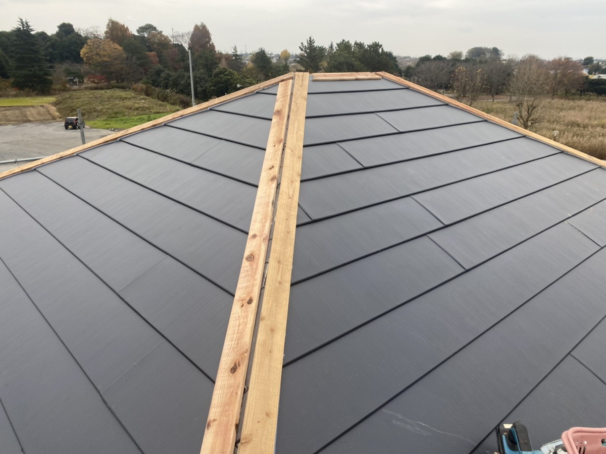 群馬県邑楽郡板倉町の屋根カバー工法|横暖ルーフ施工で寄棟・谷あり屋根を棟下地から板金仕上げまで丁寧に施工
