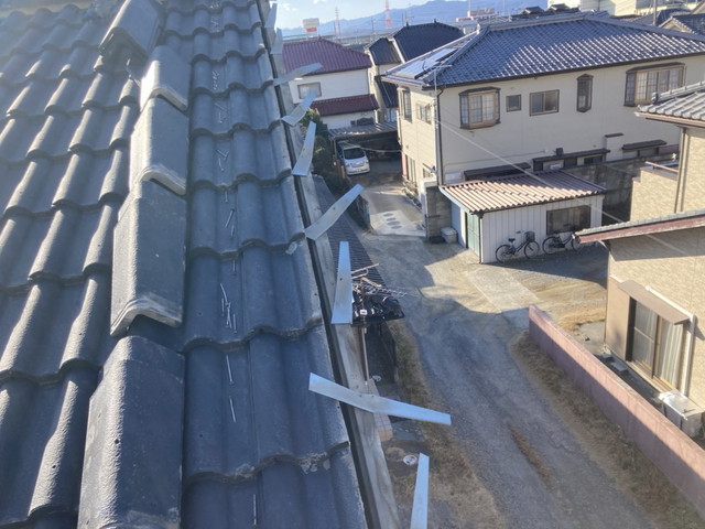 瓦を取り除いた後は、下地の状態を確認。腐食部分があるため、後日、補修および新たなケラバ瓦の取り付け作業を行う予定です。