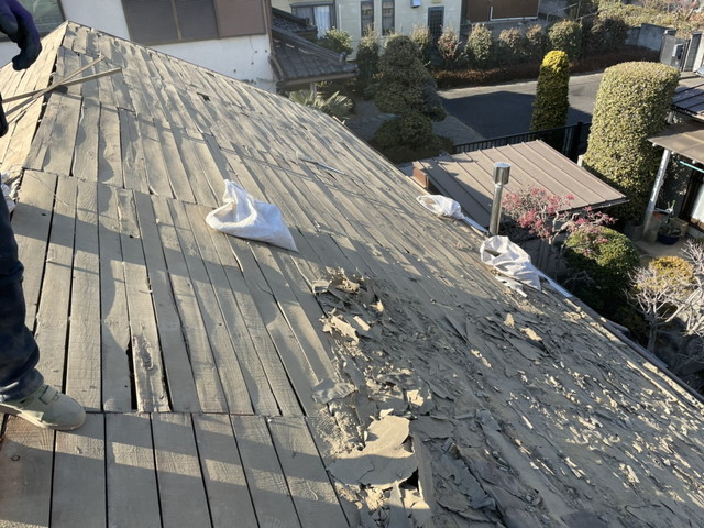 瓦の下には「瓦桟(かわらざん)」と呼ばれる細い木材があり、その下には土が敷かれている場合もあります。これらもすべて丁寧に撤去し、屋根の下地をすっきりと露出させます。