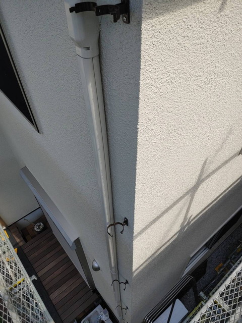 続いて、竪樋(たてどい)となる丸60に対応したたてとい金具も設置しました。今回は、合成樹脂製の金具を採用。美観と耐久性の両立を図っています。