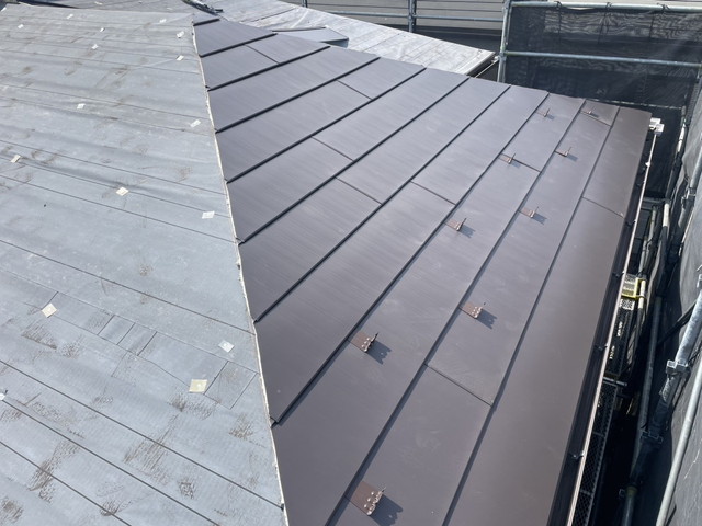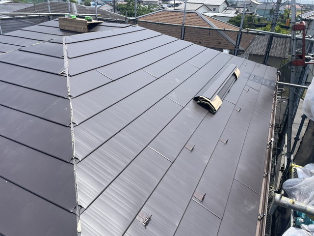 今回は、コロニアルというスレート屋根の一種にガルバリウム鋼板の横暖ルーフSという材料を使用しました。