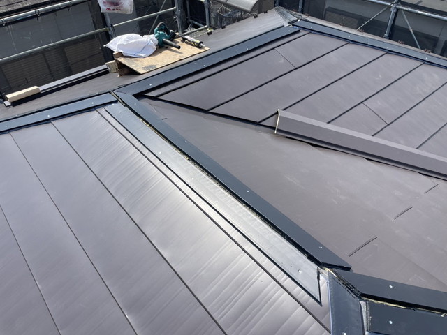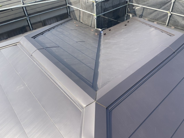 そこに棟包みの板金を被せ三又部分等もシーリング処理をし、最後に屋根全体の清掃と確認を行い完成となります。