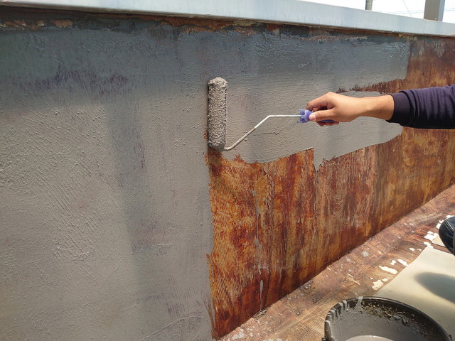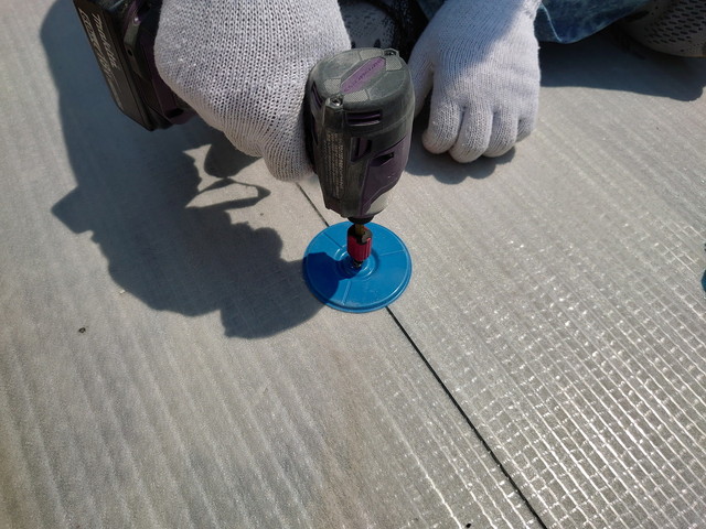 まずは古い防水層を撤去し、下地の汚れ・サビを丁寧に除去します。この作業が不十分だと、後の工程で不具合が発生するリスクが高まるため、最も重要な工程のひとつです。清掃後、下地との密着性を高めるためにプライマー(接着剤)を塗布します。ローラーを使ってムラなく均一に塗り広げていきます。プライマーが乾いたら、塩ビシートを敷設し、ディスクプレートとビスで機械的に固定していきます。これにより、風圧や動きに対してもしっかりと密着します。