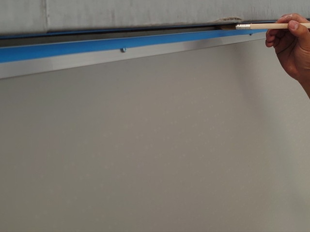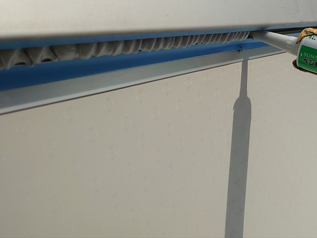 一面に塩ビシートを貼れたら、防水層のベースが完成です。立ち上がり部には、プライマー処理の後、しっかりとコーキング(シーリング)を充填し、水の侵入を防ぎます。