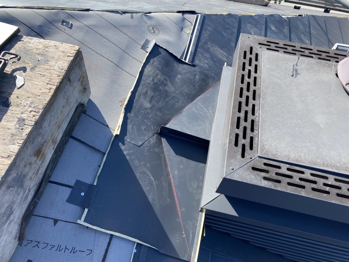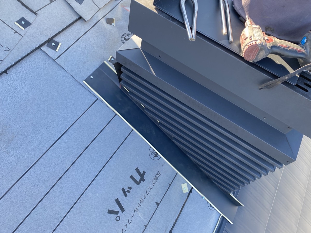 今回の屋根カバー工法施工では、特に煙突まわりの板金納めを丁寧に行いました。煙突や換気フード周辺は形状が複雑なため、雨水の侵入リスクが高い箇所です。まず防水シートを立ち上げ、重なり方向を細かく調整しながら施工を進めます。その上から専用の板金を加工し、屋根材との取り合い部分を隙間なく納めました。