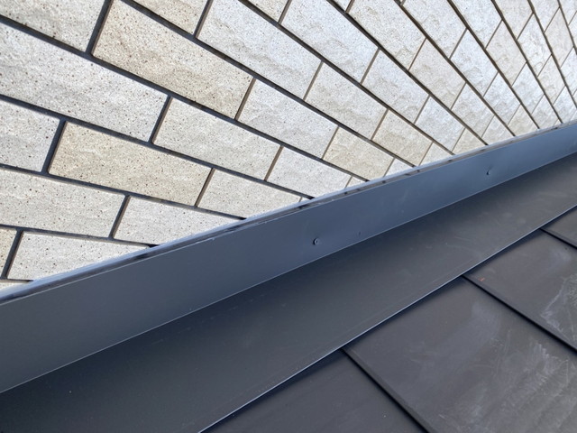 また、屋根の要となる棟板金は、下地からしっかりと固定し、強風でも浮きや剥がれが起きにくい構造としました。外壁との取り合い部分である壁立ち上がりは、専用板金を立ち上げたうえでシーリング処理を施し、防水性を高めています。こうした細部の施工精度が、屋根カバー工法の耐久性を大きく左右します。