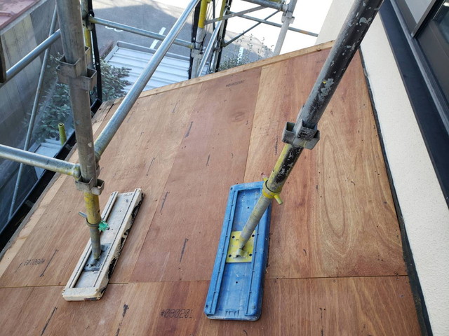 写真でも分かるように、下地が露出した状態では足場を活用し、安全第一で作業を進めます。