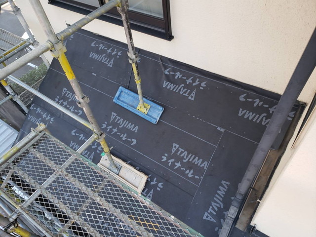 今回使用したのは耐久性に優れた改質アスファルトルーフィングで、雨水の侵入を防ぐ重要な役割を果たします。