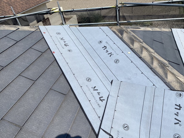 今回使用しているのは高耐久タイプの改質アスファルトルーフィングで、雨水の侵入を長期間防ぐ重要な役割を果たします。